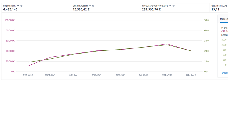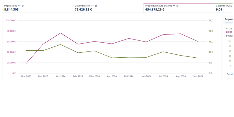 Bei einer New-To-Amazon Marke haben wir zum Start gezeigt, dass es mit einer ganzheitlichen Strategie auch möglich ist vom Stand weg Amazon DSP zu nutzen und v.a. profitabel auszubauen. Der ROAS von 9 zeigt, dass mit 72k Ad-Budget 650k Umsatz generiert werden können.