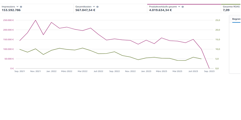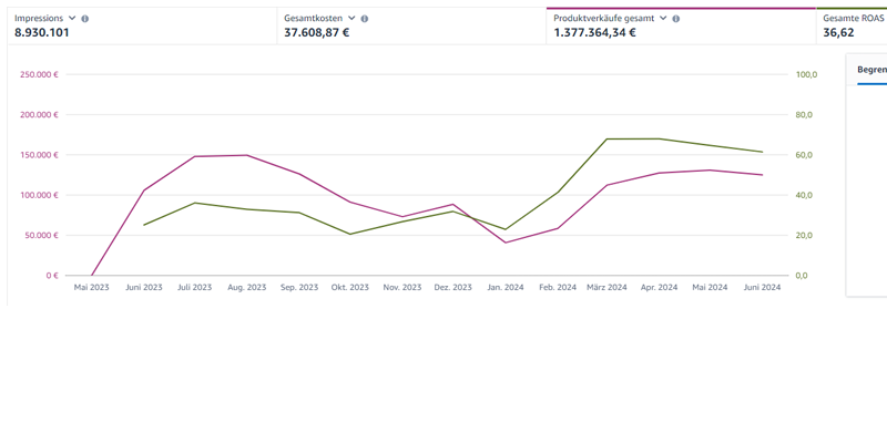 Ein sehr erfolgreicher Case im Textil-Bereich. Mit 37k Ad Budget konnte ein Umsatz von 1,37 Mio. € erzielt werden = ROAS von 36,62!